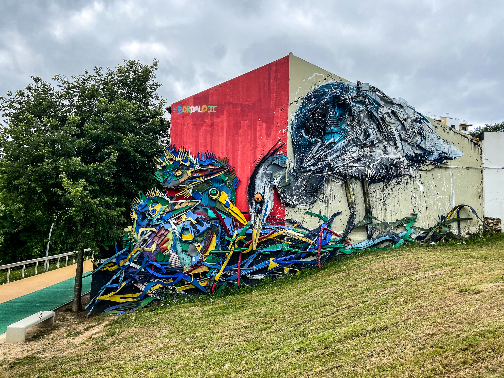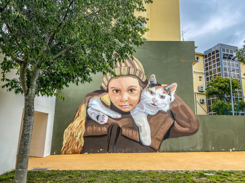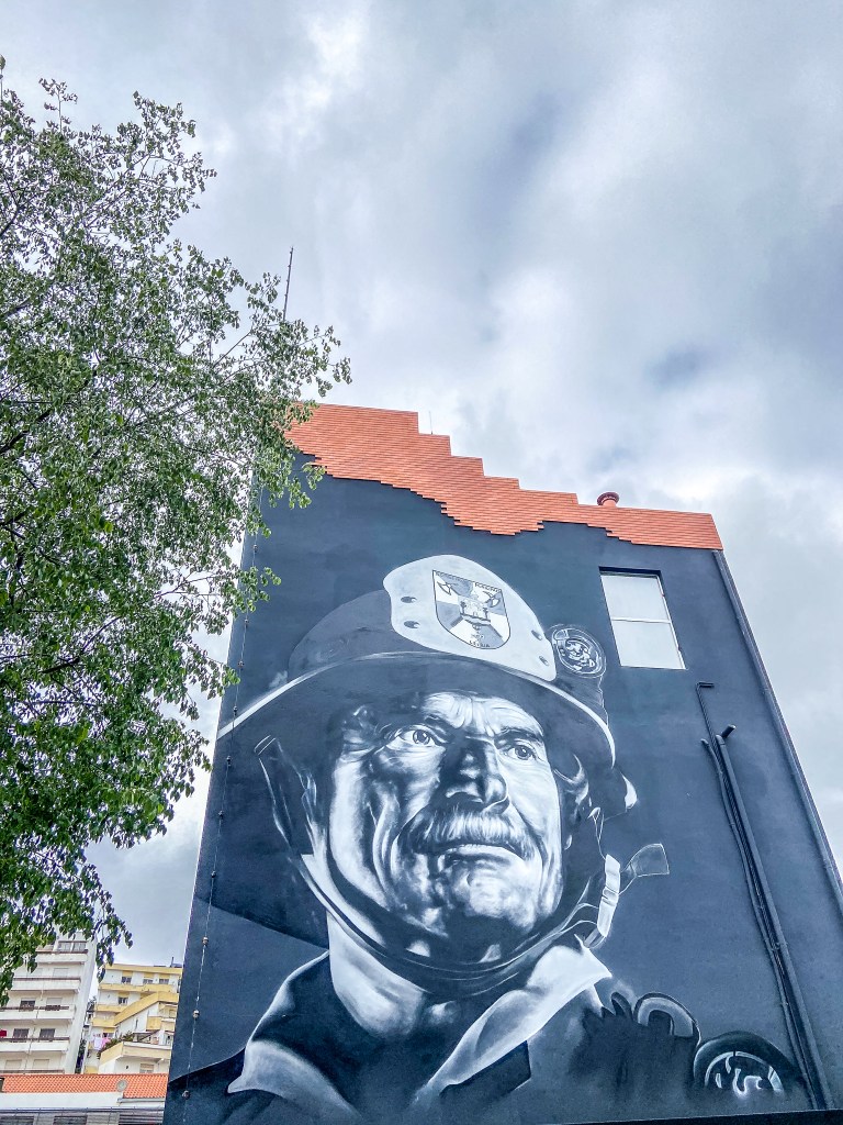 Perhaps because I am definitely a cat lover, I find this one particularly touching. I am not sure if intentionally, but I love how the kid’s eyes are the same colour as the eyes of the cat. This is by Ricardo Romero, a local artist who was also the master behind the sculpture of the Black Cat I mention in this post.The portrait of the fireman was painted at the back of a building part of the Municipal Firemen of Leiria. It is incredibly realistic portrait, a great homage to the fireman that every year put their lives at risk fighting the fires that keep destroying our forest every summer. By artist Robot