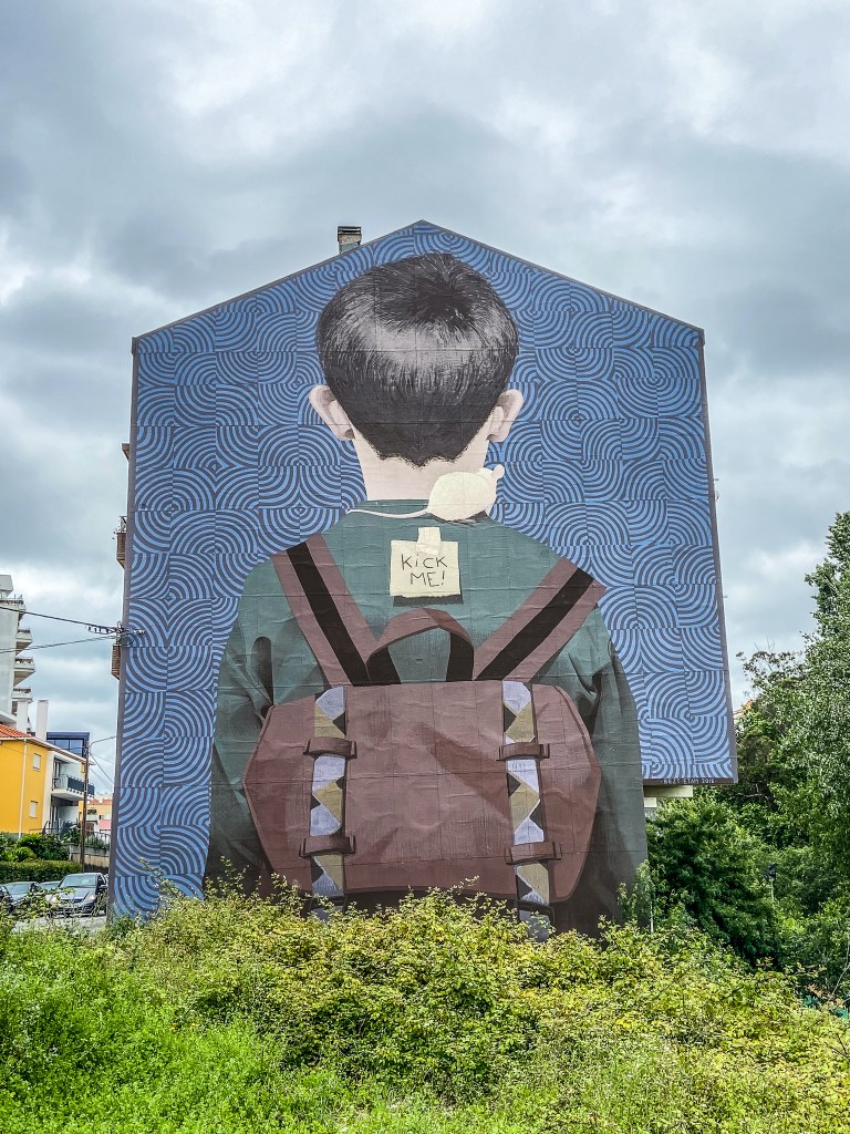 This one was made on the back of the Theatre. I really like this one. The contrast between Ancient Greece and the contemporary graffiti on the background.What about this one, isn’t it adorable, and yet so dad? The weird kid at school with his little pet mouse. Being bullied at school. By Betz ETAM. The artist used multiple materials to build the nest of the stork. This is by BORDALO II . Check out his Instagram, I really like his work.