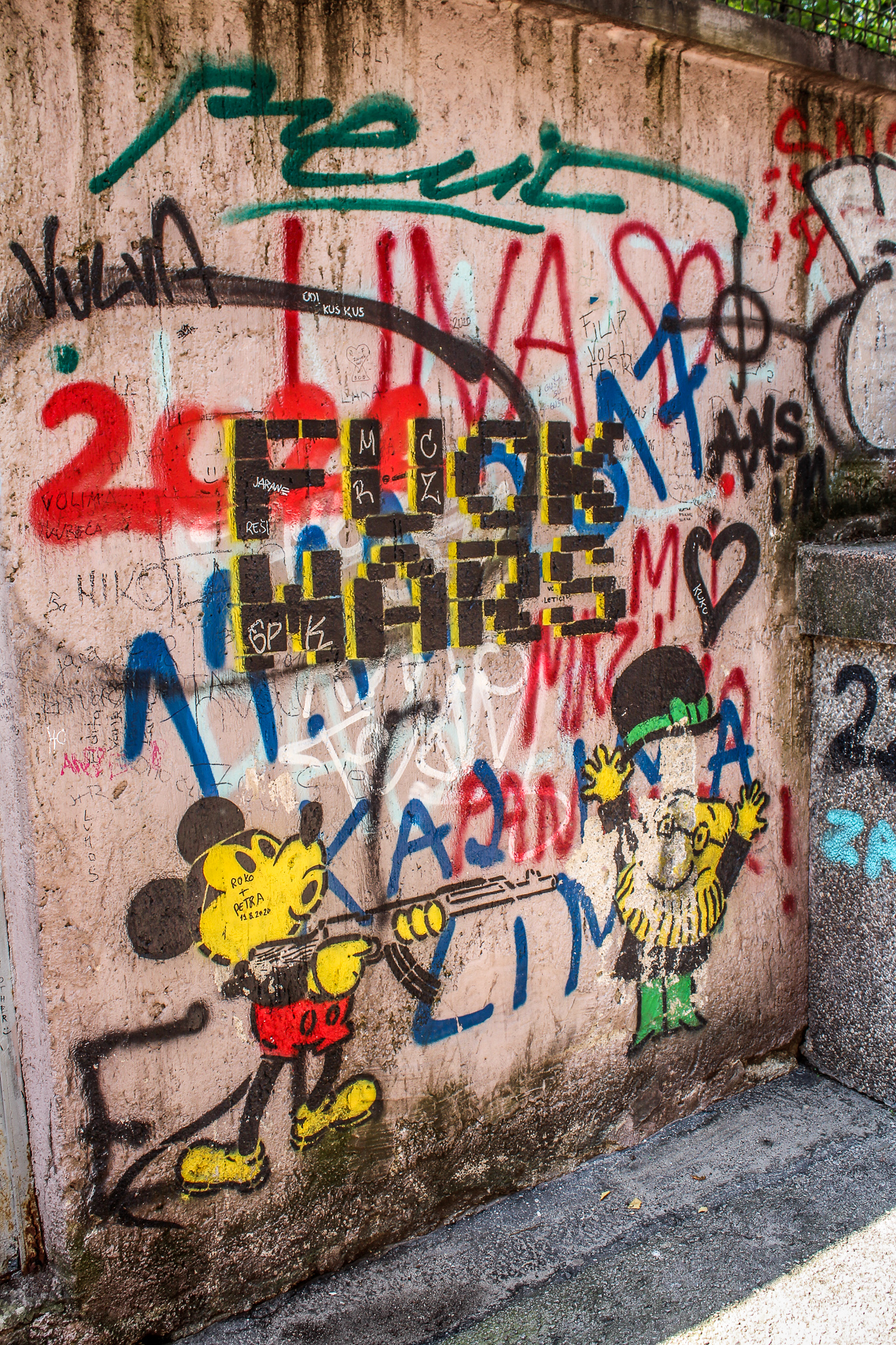 Well, when researching about Zagreb I found out this is a city with walls also full of art and I decided to go on a little hunt to spot the masterpieces out there. Some I found by accident, others I had seen the coordinates online. Grafitti seems to be part of the culture for a long time. In a way, parts of Zagreb reminded me of Lisbon – walls, doors, street signs, randomly graffitied with signatures or random sentences or words. I don’t like this. It seems like vandalism to me. Makes any place look dirty.