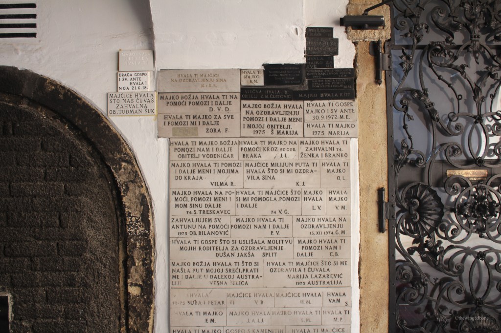 The below shot is from the inside of Medieval stone gate into town with a Virgin Mary shrine popular for prayer & candle lighting. The legend says that many years ago a huge fire destroyed the whole city, but a painting of Mary with baby Jesus survived the flames in this place. Since then, locals come here to light a candle and ask for help. These different tiles have the word Hvala (thank you in Croatian).
