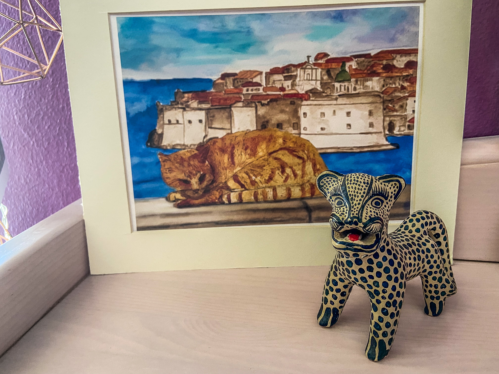 If I were to say, at these right moment, the souvenirs that rank the highest are the below – and therefore they are together in my shelf – a Jaguar from San Cristobal las Casas, Mexico and an illustration from a local artist in Dubrovnik that I immediately fell in love with.