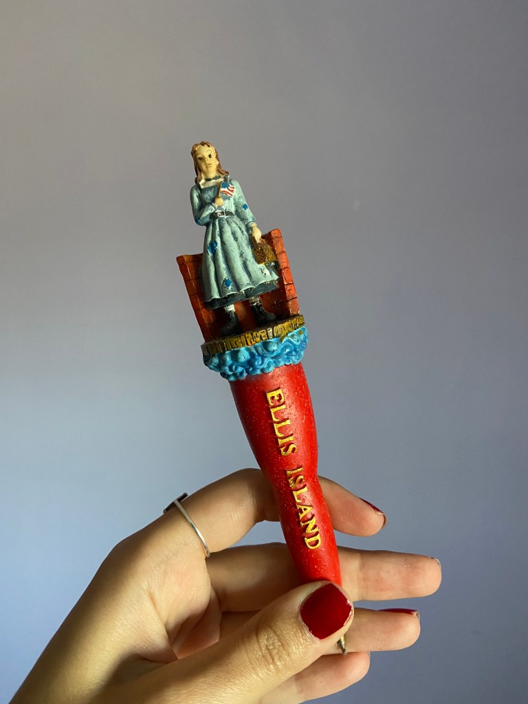 One of my first big trips was to the USA when I was 16 years old. This was huge for me. I was finally going to know the country where I was born (my parents were immigrants, and I was born in Long Island, NY, and six months later we moved back to Portugal). It was a big dream of mine, but this was a family trip and I could not afford much. I was about to finish high school and had no money of my own. But my parents allowed me to buy a pen in Ellis Island when visiting the Statue of Liberty, which I still have on my desk and still love – a pen with an emigrant girl holding a little US flag close to her heart. At the time, my dream was to live in the US one day. The American dream permeated my skin. This is still an item that is important to me.