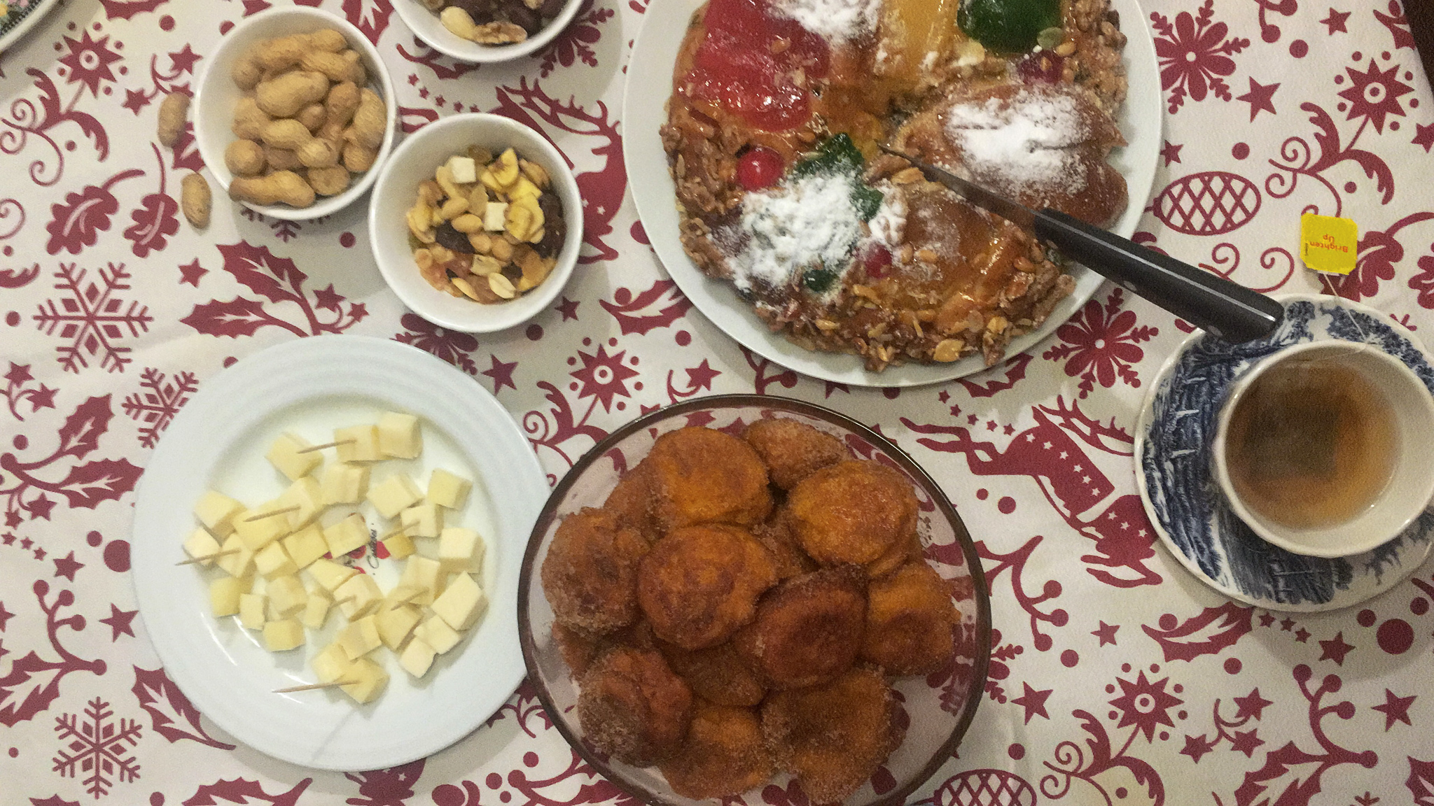 The cake is basically sweet bread, with a consistency similar to brioche, shaped like a crown, and it’s very rich with nuts and crystalised fruits. Inside there are usually two small gifts – a dry bean and typically a figure of the nativity scene. Whoever gets the dry bean in its slice, is said to have to pay for the cake, or for everyone’s drinks.