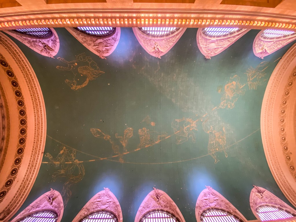When inside, look up. The ceiling is something unique, a blue sky above your heards, a mural of constellations – this is not the original mural, which was quickly deterioating after 11 years of being painted, with a leaky roof causing mold in the mural. It was in 1944 that the “restoration” took place – except that instead of restoring the original mural, this was simply covered with cement boards, and a completly new work was pained from scratch. Probably for the better if this new structure stops leaks – it’s been over 70 years, and it seems… all right? In the photo I took below you can see the borders of the cement boards.