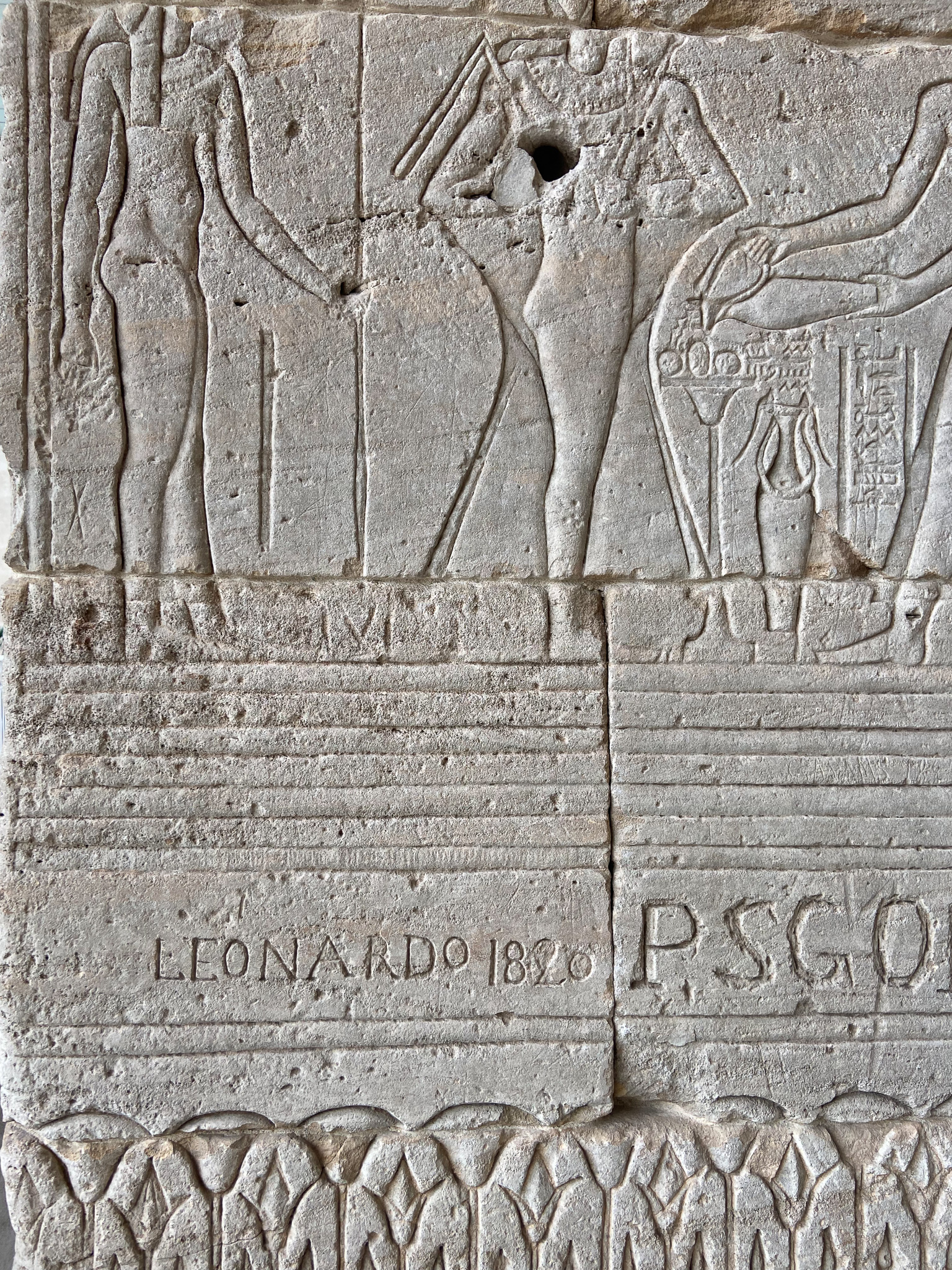 What immediately caught my eye once I got closer to the carved walls of the temple, was that there were other carvings that one doesn’t typically find in artefacts in museums. Graffitis. What the f* Leonardo from 1820!? I exclaimed to myself. But then I realised Leonardo from 1820 wasn’t the only one who decided to leave his mark in this temple, which at the time was still located in Egypt. The first marks were done just five years after the temple was built, dating back to 10 BC, done in colloquial Egyptian script. Then in 400 AD, a few Greek Coptic Christian inscriptions were made when the temple was temporarily converted to a Christian church. Only after, in the 19th century, comes our friend Leonardo & Co – a group of travellers who felt like chiselling their names into the sandstone.