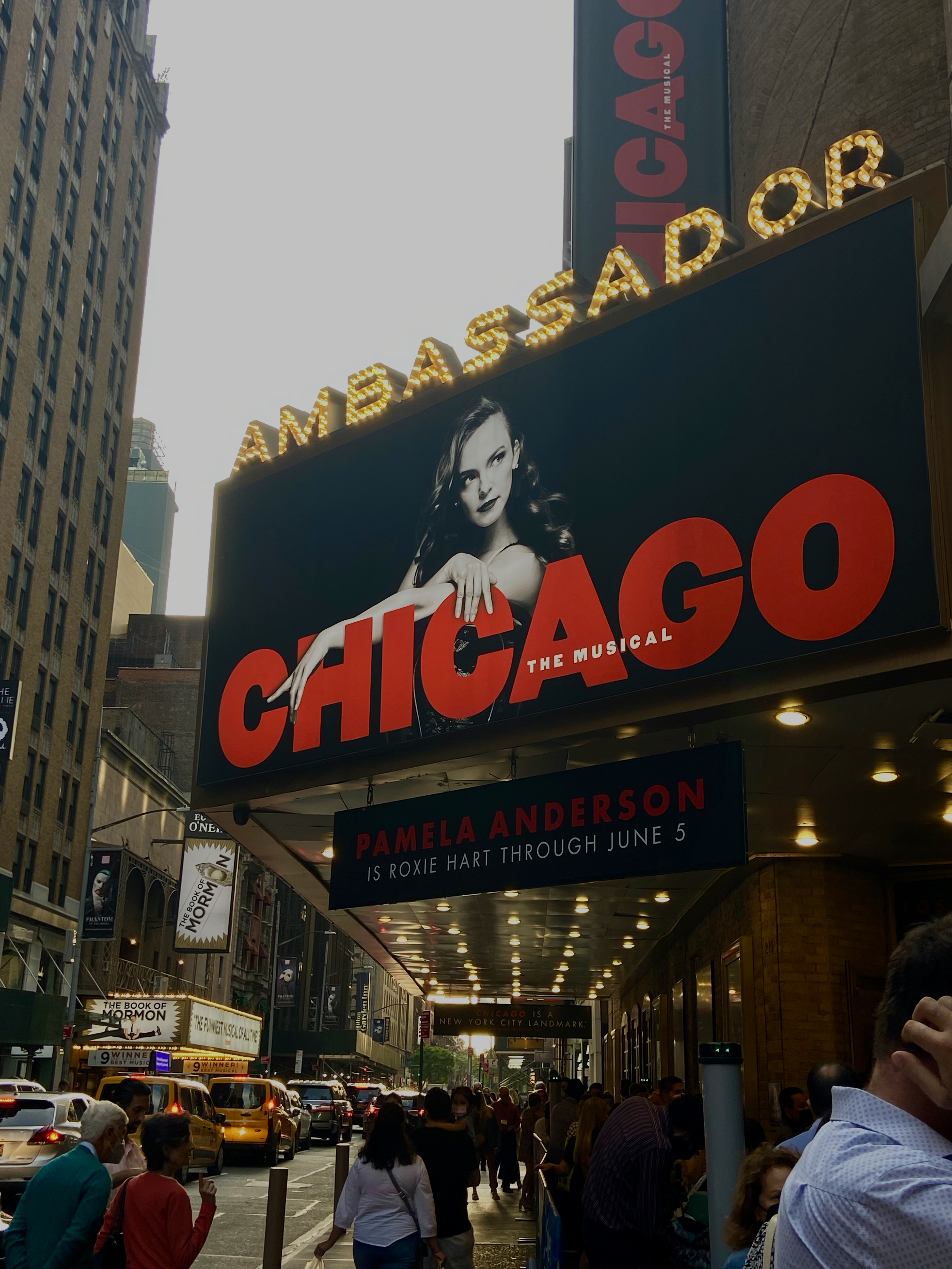 I indulged and bought myself a ticket for a musical that does not exist in London – Chicago. I first found my love with this musical through the film adaptation from 2002, starring Renée Zellweger, Catherine Zeta-Jones, and Richard Gere. The music, the plot, the dark comedy, the dancing… fascinating. I knew I wanted to go a see a show in New York, and I didn’t have to spend much time deciding. Then I realised that Pamela Anderson was actually starring as Roxie in the show, so now I can also say I’ve seen Pamela Anderson performing in a musical…