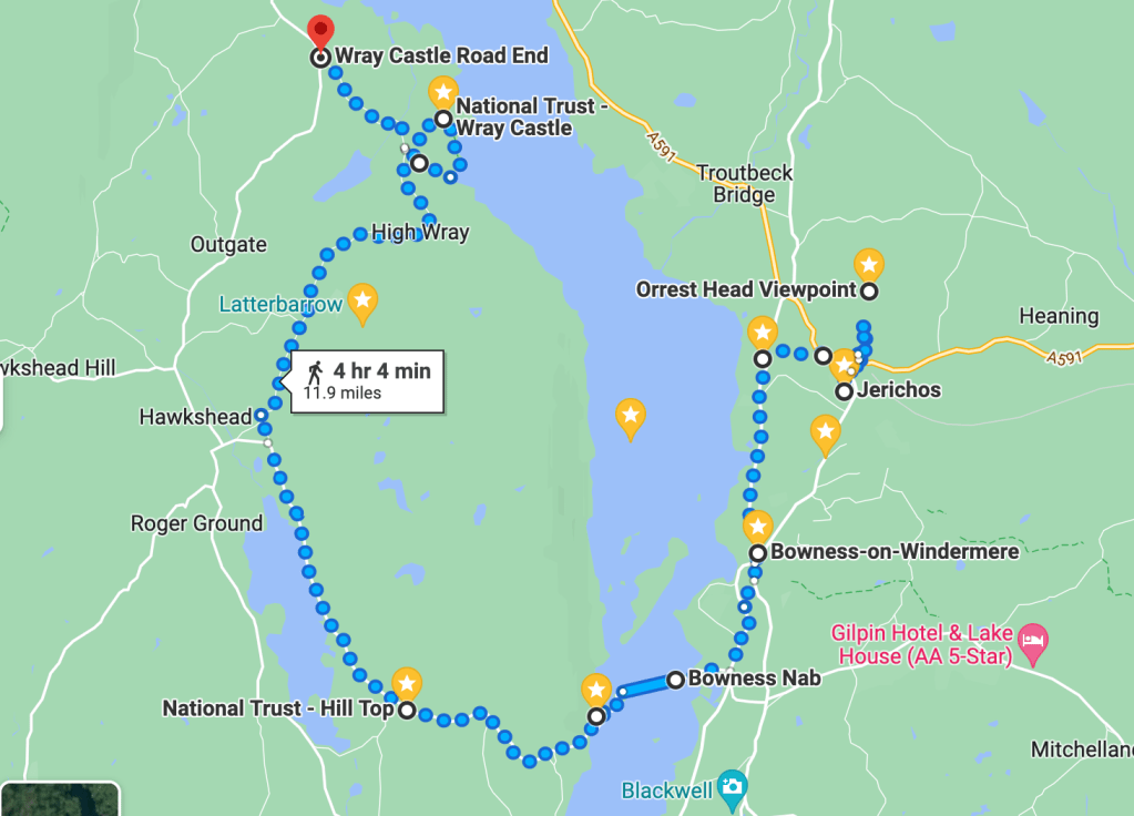 For my first day in Windermere, below was my itinerary. As you can see I covered an extensive area – all on foot, using a ferry and then a bus back to the town of Windermere. Google Maps isn’t giving you a perfect representation of my walk – there were paths for walkers, not yet covered by it. What I find quite interesting is that walking 20 Km in nature is not the same as walking 20km in a day in London or New York. Not as tiring. Not when you’re surrounded by the same material you are made of.
