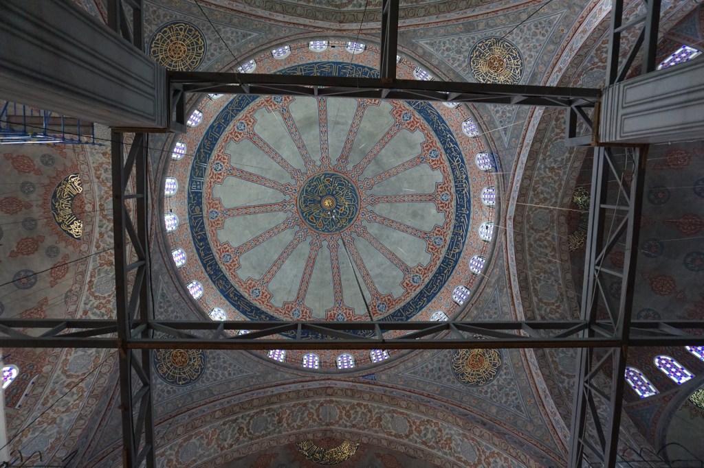 After Mehmed, the Conqueror converted Hagia Sophia into a mosque, it became the main one in Istanbul until the construction of the Sultan Ahmed Mosque – commonly known as the “Blue Mosque” due to its interior decorated with blue tiles. Unfortunately, this was under renovation at the time of my visit and all I could see was the below – which doesn’t even loo that blue.