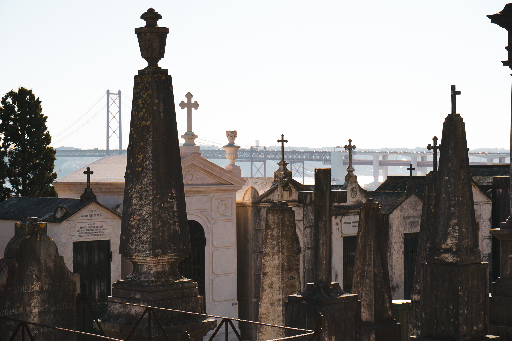 It was built in the romantic period, in 1833, when a cholera morbus outbreak in the city made it very clear that more burial spaces were needed. Until then, burials only took place on religious grounds, but a law was passed that for health and safety reasons, new spaces specifically dedicated to burials would be created. The cemetery contains mostly private mausoleums from prominent families of the city, who hired architects and sculptors to design their eternal resting places. As a result, when strolling through the cemetery, you have the feeling you are walking in small streets surrounded by little “houses”. Except that only dead bodies “live” in there. Another plus of visiting this place is the view you get of the river and the 25th of April Bridge (also known as the Golden Gate of Lisbon).
