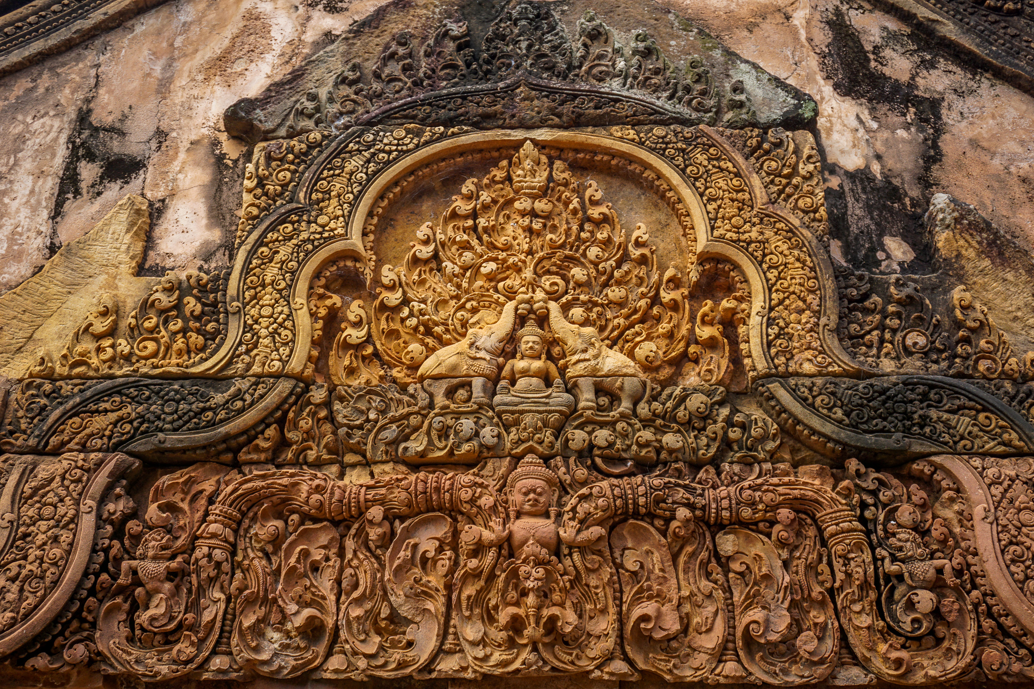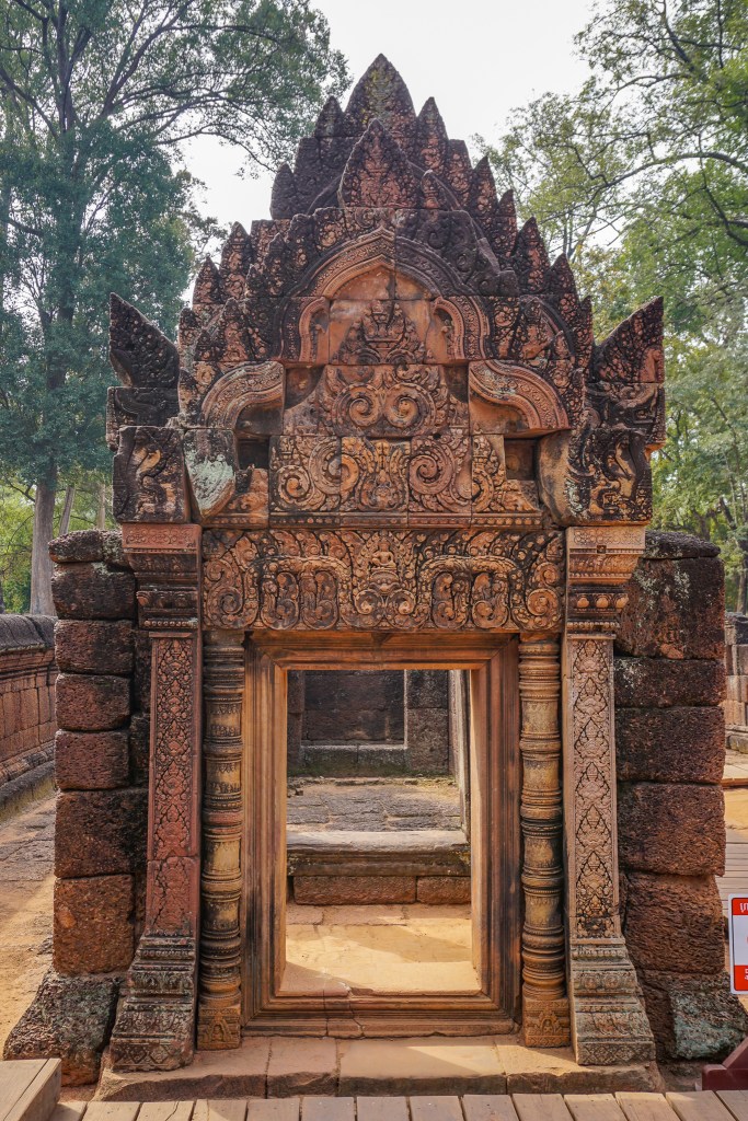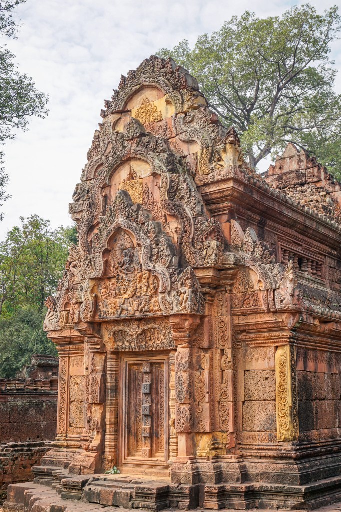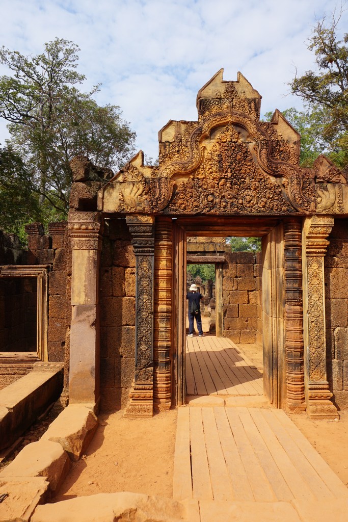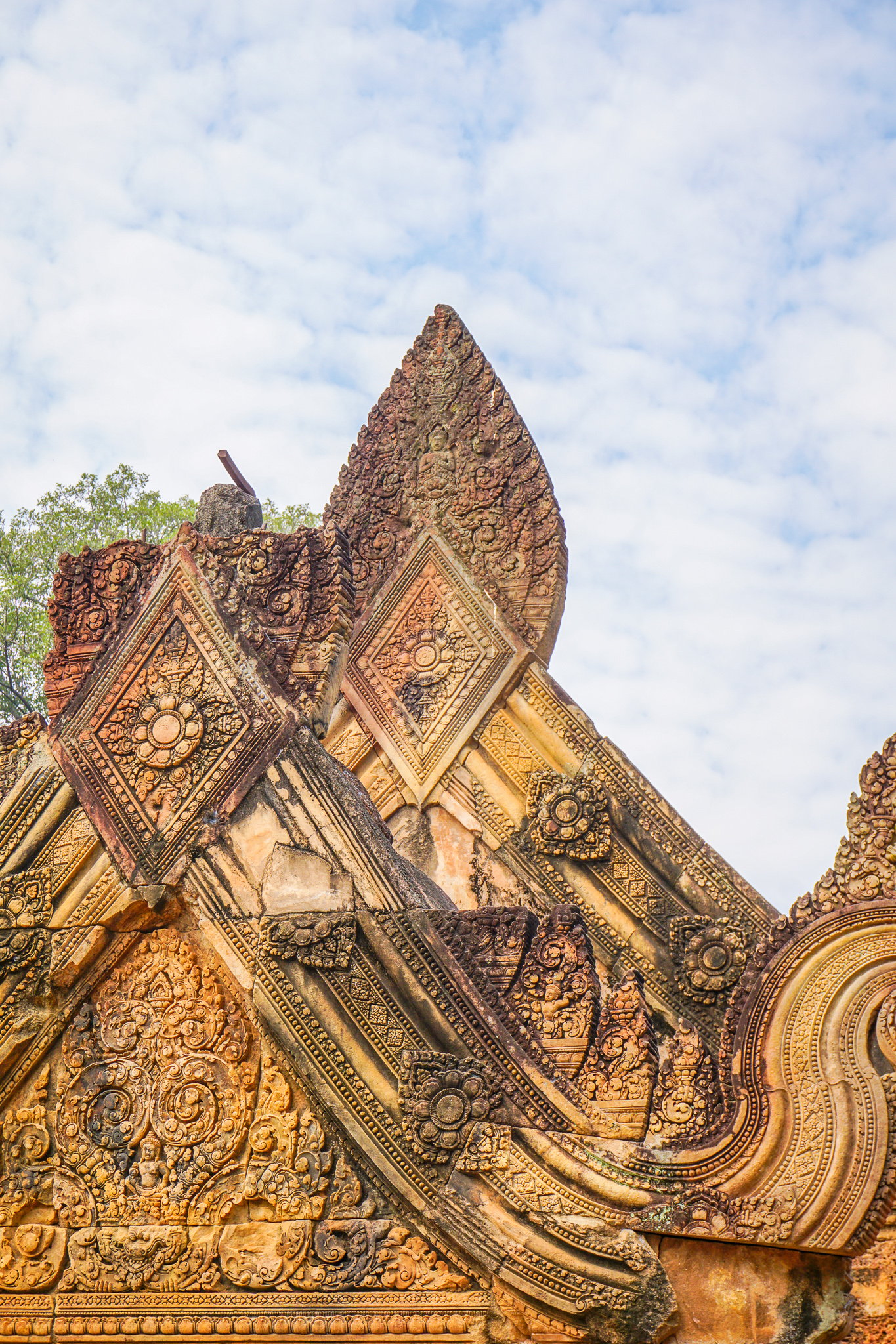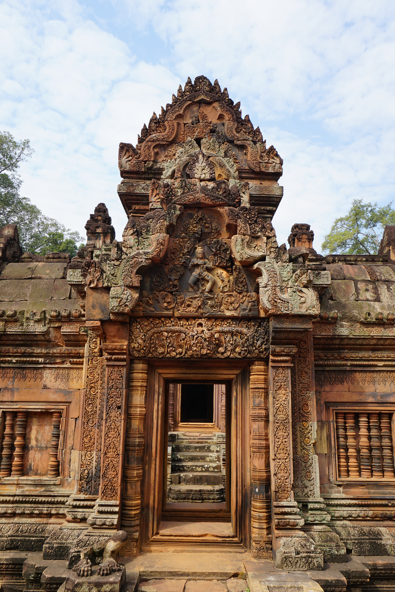 Let’s talk a little about the temples of this second visit. The main attraction on this second day was the Banteay Srei Temple, which means Citadel of the Women. The name comes from its delicate carvings, which some have conjectured could have not been made by the hands of the men, as they are so delicate…which is of course a very weak argument that makes no sense. It is also known as the Pink Temple as its stone has a pinkish hue. This temple is dedicated to Shiva, and whilst it’s much smaller than its counterparts, it is incredibly well preserved, and its carvings are indeed beautifully made, making it a must-visit, if you can spare the time. Thank you Nature, for being good here!