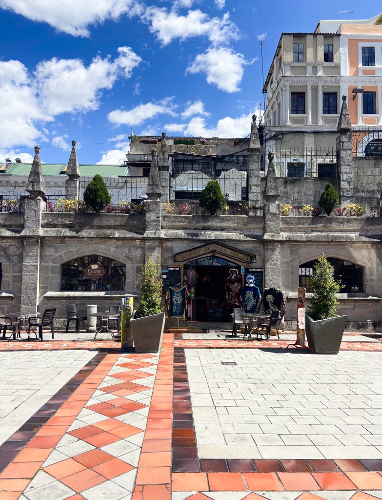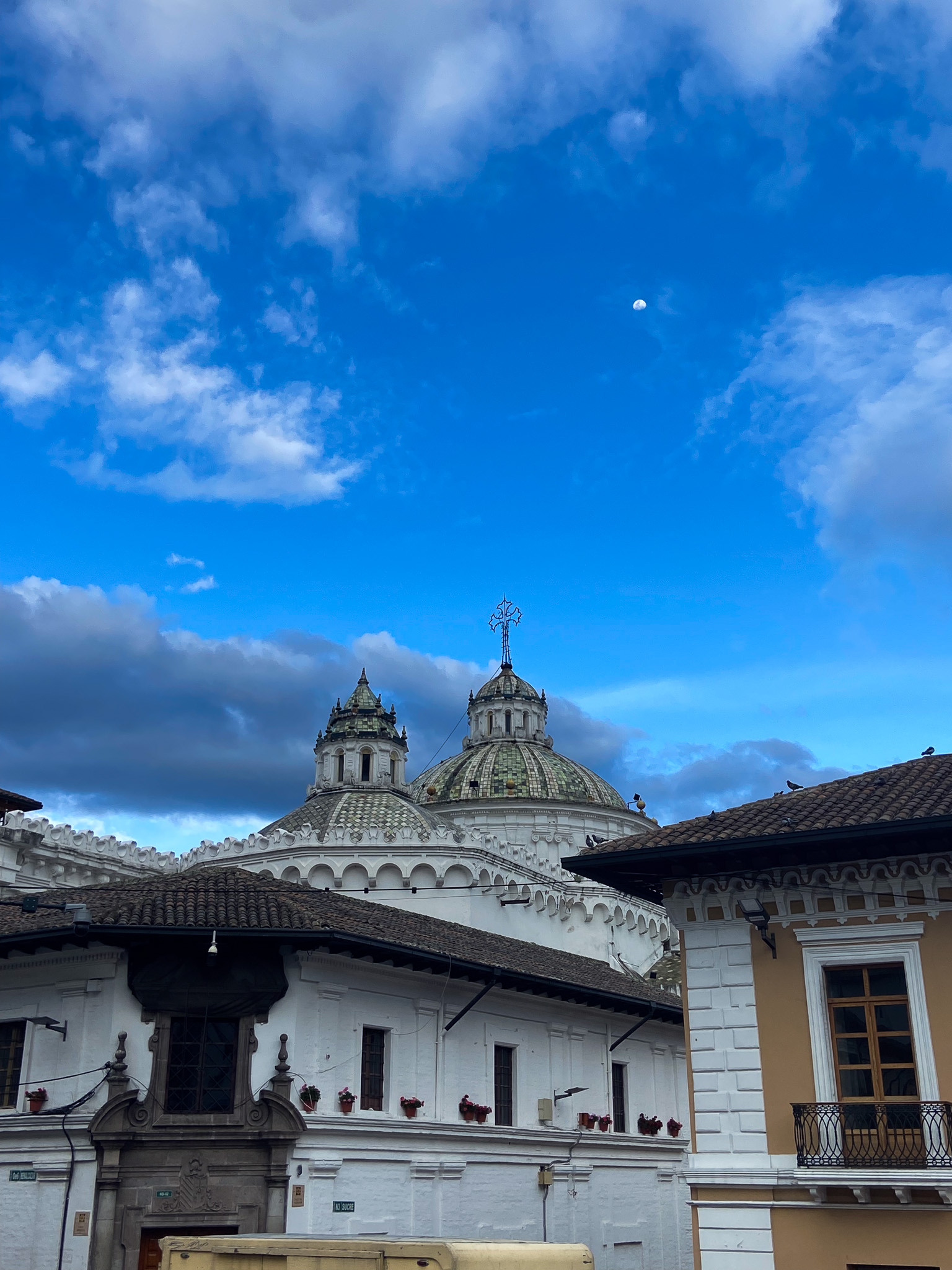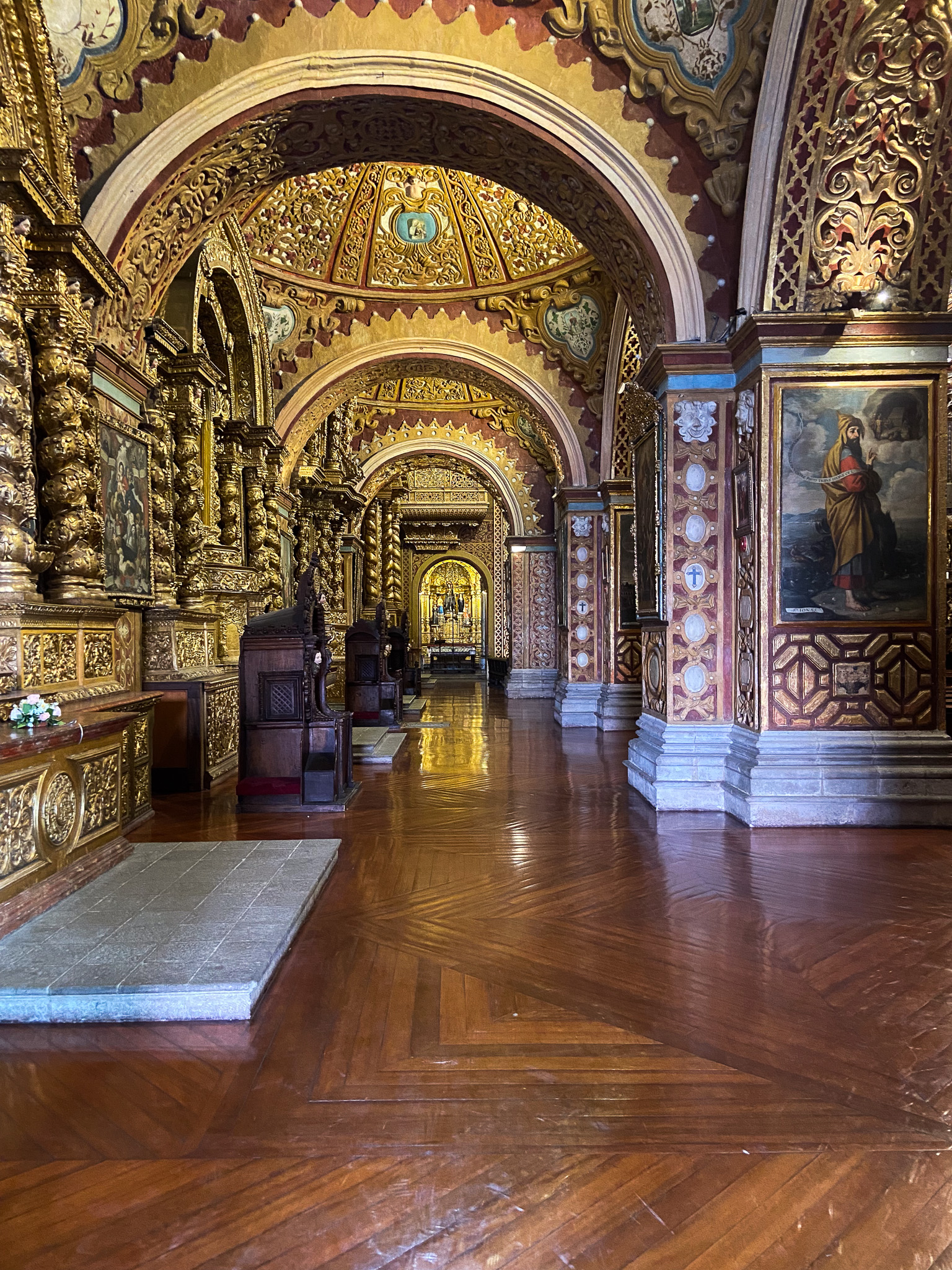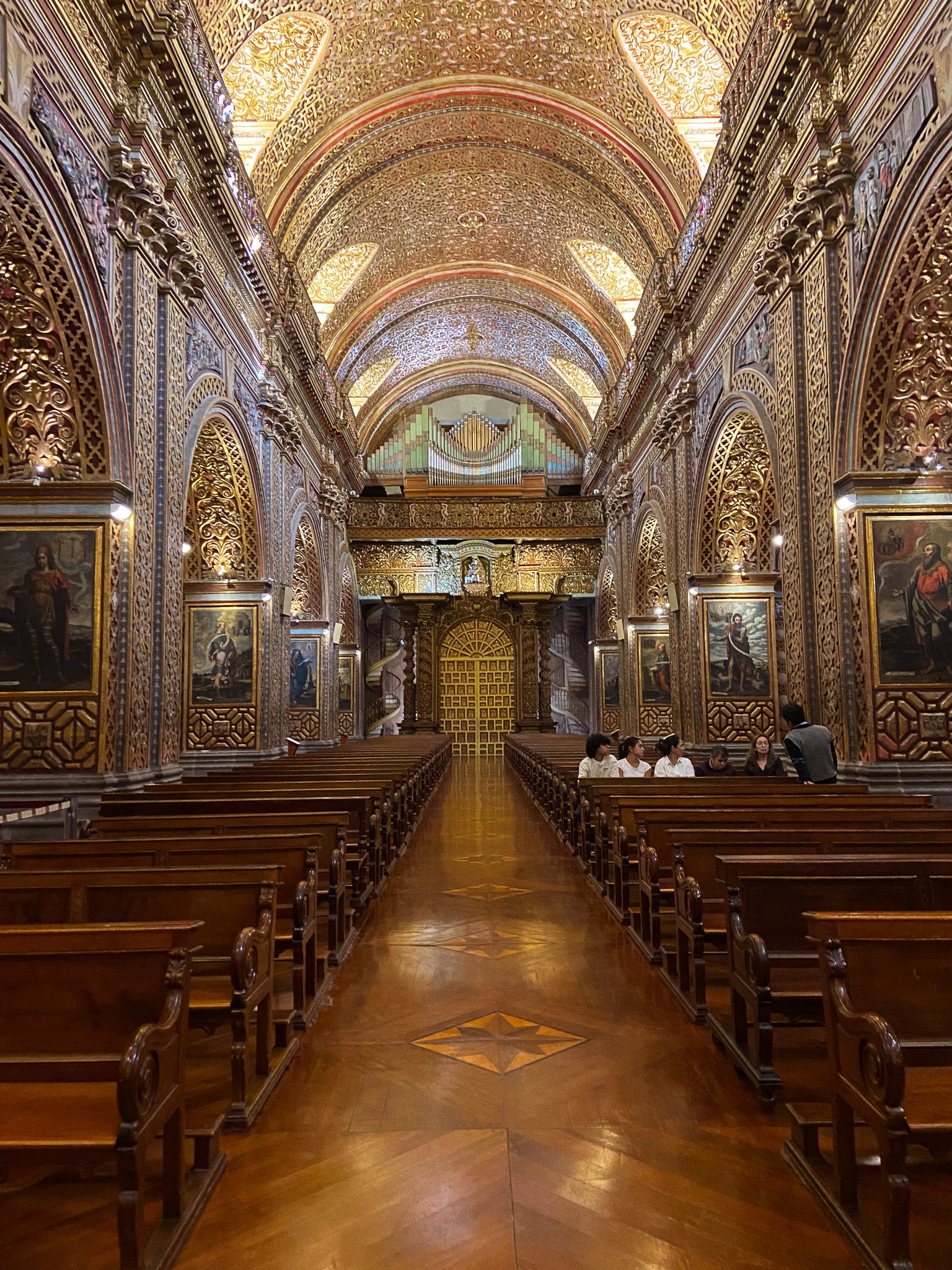 This is one of the most iconic churches in Quito, known for its gilded interior and breathtaking Baroque architecture. Its interior is covered in gold leaf, showing an opulence similar to those found in Europe. Still, I believe what makes this church even more special is how it has incorporated elements of Moorish and indigenous Ecuadorian artistry. This church was built by the Jesuits between 1605 and 1767, as part of their mission to spread Christianity in the Americas. You aren’t supposed to take photos inside, but I managed to take a couple… (I know this was naughty and atypical behaviour of me).