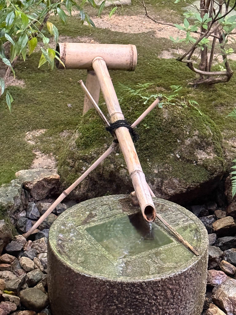 There is something very special about the washbasin (Tsukubai) located behind the priest’s quarters. I had learned about it during my stay at the Ryokan, where they had a replica. It’s shaped like an old coin, and it bears an inscription that translates to “I learn to be content”.