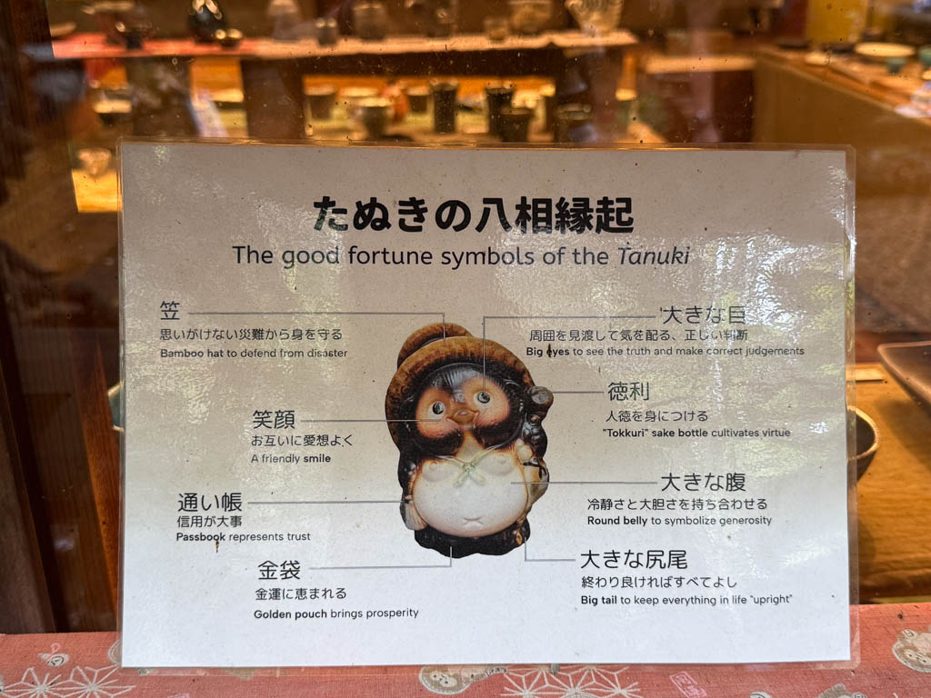 It was in these parts of Kyoto that I came across yet another good luck charm – Tanuki. These are ceramic Japanese racoon dogs representing prosperity and good fortune. I often saw them at the entrance of shops – it’s adorable, and every single part of it has a different meaning, which is fun to learn about.