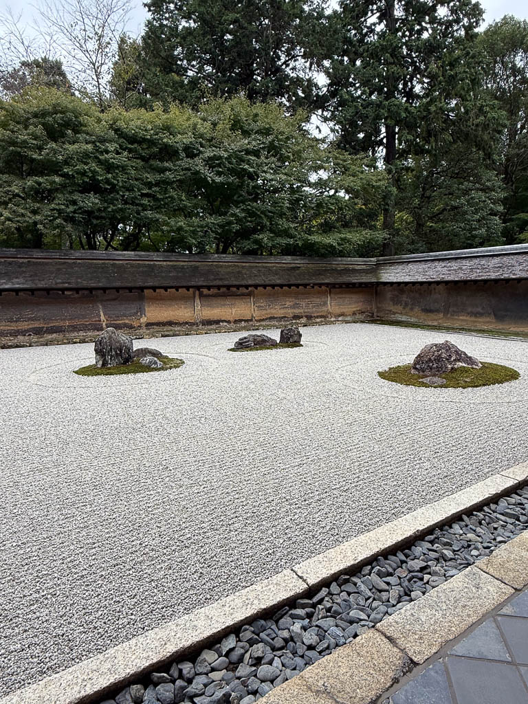 The garden considents of 15 stones of various sizes arranged in five groups on a bed of meticulously raked white gravel. The stones are arranged so that from any vantage point on the temple veranda, at least one stone is always hidden from view. In Sen philosophy, the number 15 symbolizes perfection, so the inability to see all 15 stones at once suggests that human perspective is inherently limited and somehow flawed.