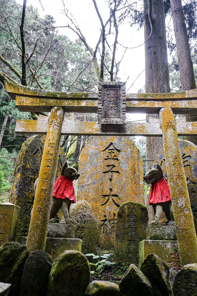 I took my time to notice the details of the Torii, admiring the many mini Torii in smaller shrines through the trail, with the foxes dressed up in their bibs. I love foxes – back home people dislike them because the come at night hunting for my parents’ chickens forcing them to always locked them at night; in London, people complain they create a mess by foraging in the trash cans. To me foxes are survivors.Witty, agile, adaptable. I adore catching them at dusk when I’m back home. Shiny, deep black eyes, coats of fire, tales aflame. Stunning animals. Sacred indeed.