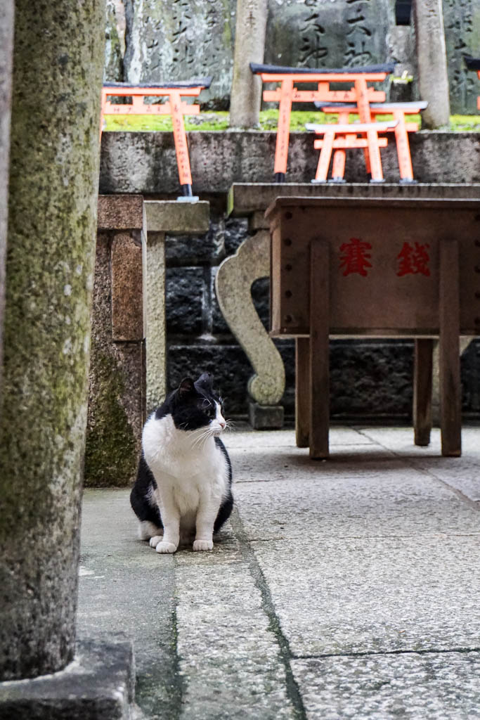 As I was just approaching the base, I spotted a black and white cat (if you’ve been reading my posts you know I’m crazy about felines) and managed to take a photo of it with some torii in the background. Cats have historically protected so many places – in Europe particularly from the plague, and in Japan they were used to protect the rice stores and sacred texts from rodents. This cat though definitely didn’t seem like he would even chase a rat if it saw one… it had that air of domesticity only smug city cats have learned to develop.