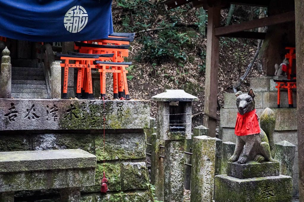 I took my time to notice the details of the Torii, admiring the many mini Torii in smaller shrines through the trail, with the foxes dressed up in their bibs. I love foxes – back home people dislike them because the come at night hunting for my parents’ chickens forcing them to always locked them at night; in London, people complain they create a mess by foraging in the trash cans. To me foxes are survivors.Witty, agile, adaptable. I adore catching them at dusk when I’m back home. Shiny, deep black eyes, coats of fire, tales aflame. Stunning animals. Sacred indeed.